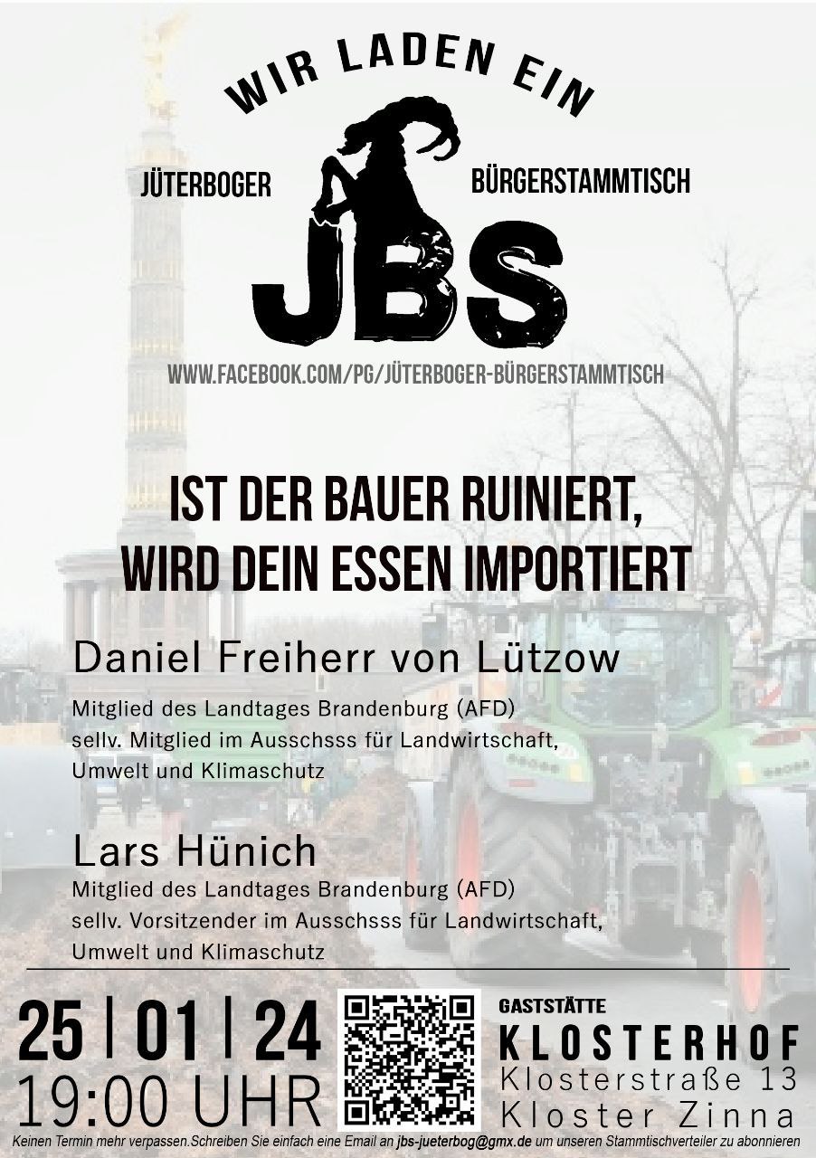 Jüterboger Bürgerstammtisch – Blick über die Landesgrenze Kalender Zum Kalender hinzufügen Zu Timely-Kalender hinzufügen Zu Google hinzufügen Zu Outlook hinzufügen Zu Apple-Kalender hinzufügen Einem anderen Kalender hinzufügen Als XML exportieren Wann: 25. Januar 2024 um 19:00 2024-01-25T19:00:00+01:00 2024-01-25T19:15:00+01:00 Wo: Gaststätte Klosterhof Klosterstraße 13 14913 Kloster Zinna